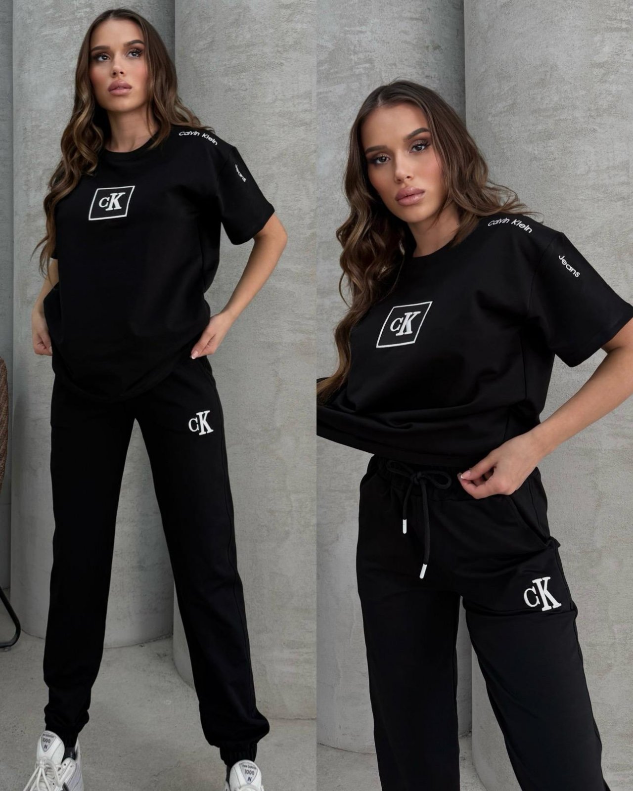 Горната част е елегантна блуза с къс ръкав, която подчертава силуета, докато долната част е с дълъг крачол и класическа линия – идеална както за ежедневието, така и за свободното време. Фин акцент е бродираното лого на Calvin Klein, което носи усещане за лукс и разпознаваем стил.