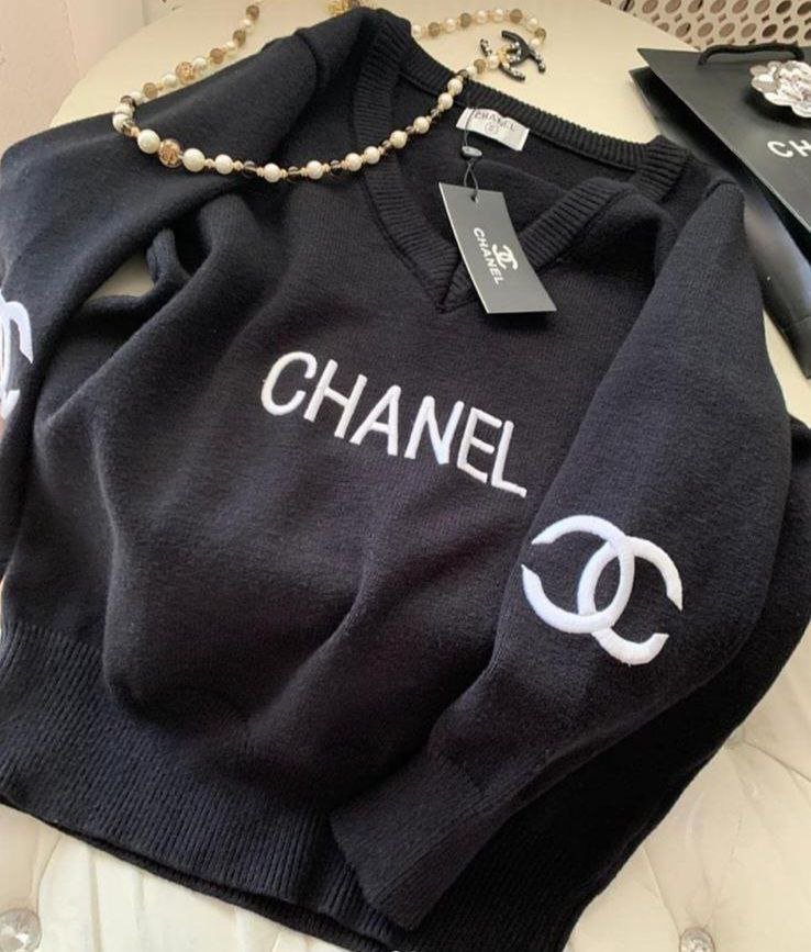 Това е черен и бял плетен пуловер с дълги ръкави. Върху предната част на пуловера е избродирано логото на марката с големи бели букви. На ръкавите също има емблематичното двойно „C“ лого, символ на марката, изработено в бяло. Материята е мека и топла, идеална за хладно време.