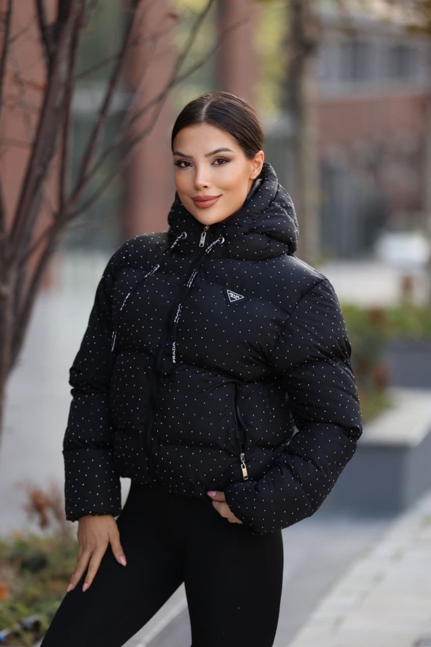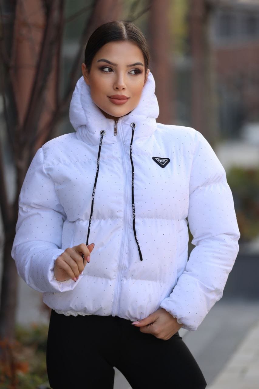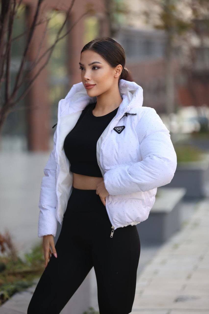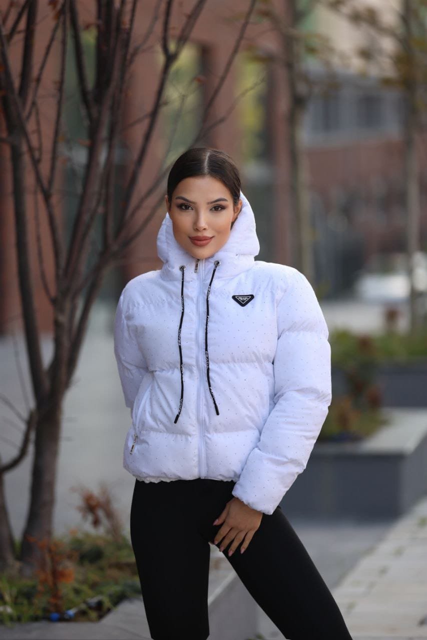 Изработено със силиконов пълнеж, якето осигурява отлична топлина през студените зимни дни, без да утежнява силуета. Дизайнът е минималистичен и изискан, като фините кристали придават деликатен блясък и усещане за изтънченост. Стилът е допълнен от висококласна бродерия с логото на PRADA, която подчертава неговия премиум характер.
